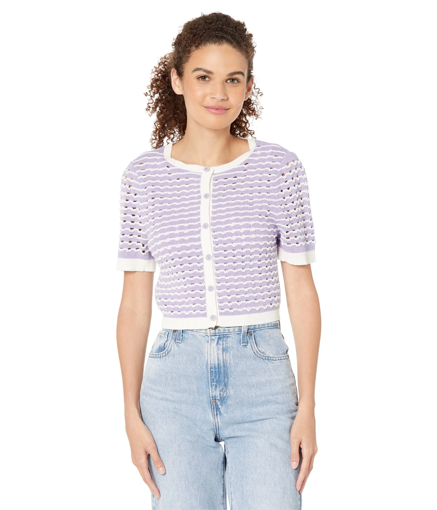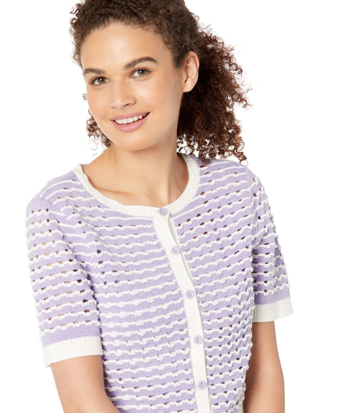- The BCBGeneration® Crochet Sweater Top V1VX3S01 brings comfort to this button-up sweater with a piped trim for chic style.