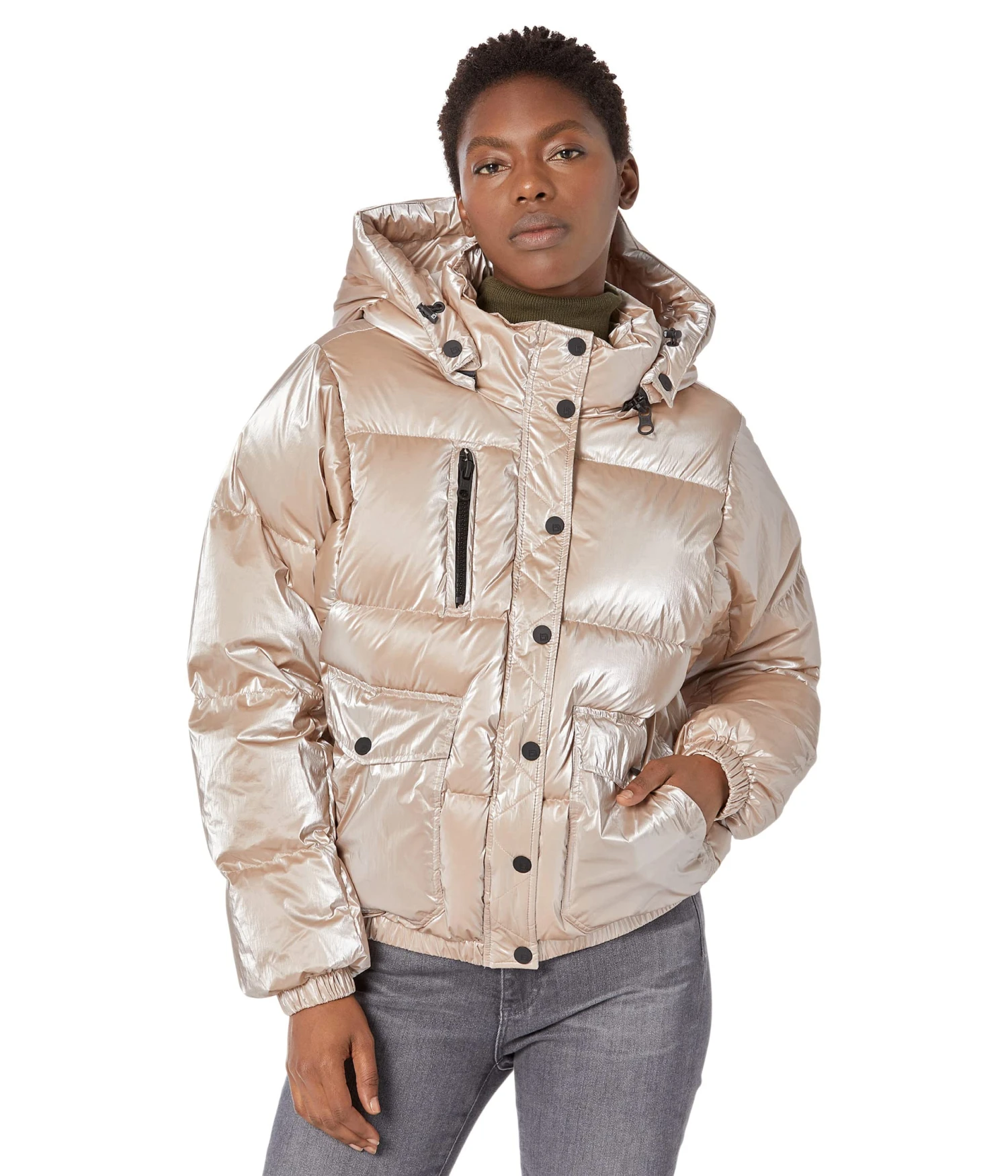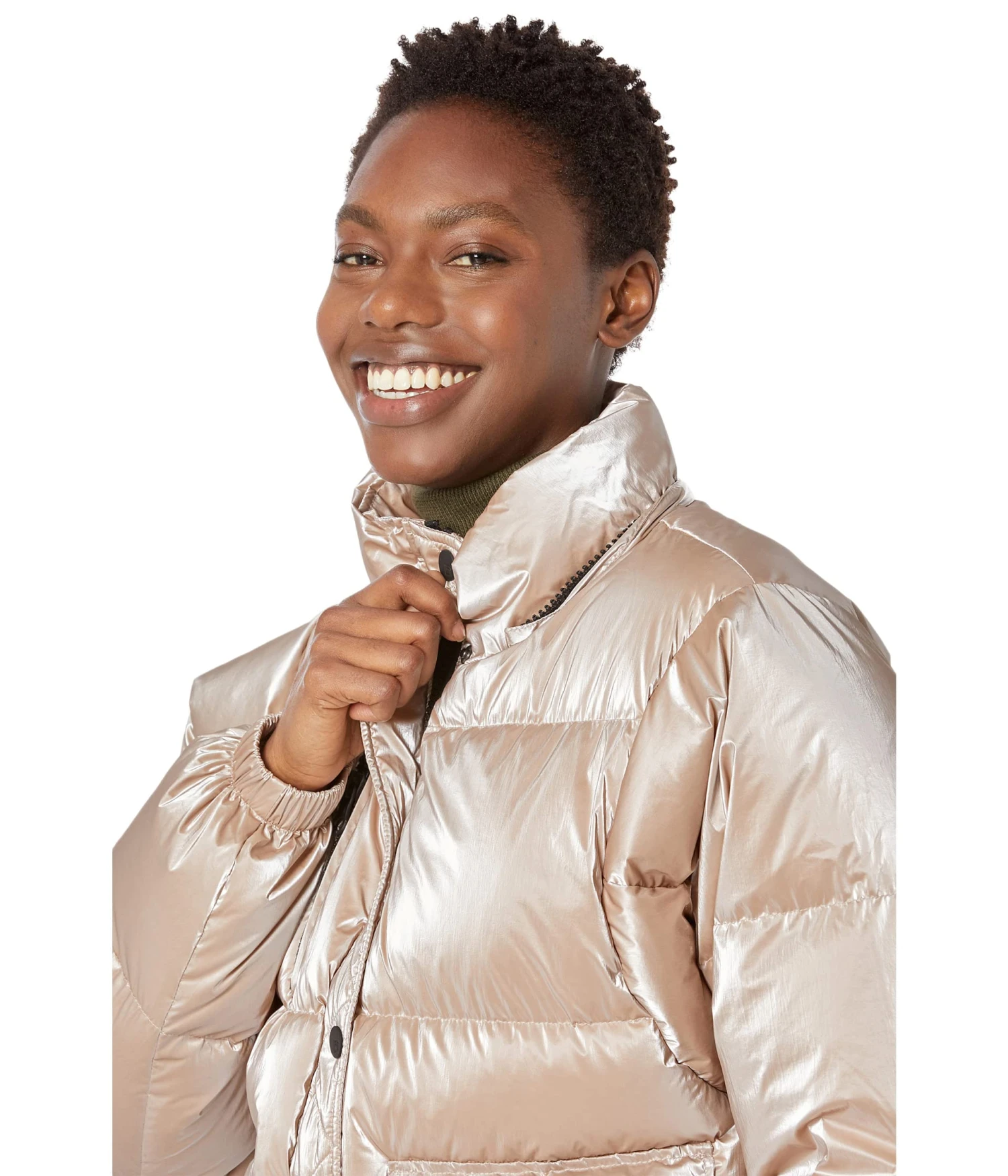 - Relaxed fit puffer jacket features a polyurethane shell and moisture-wicking nylon lining.