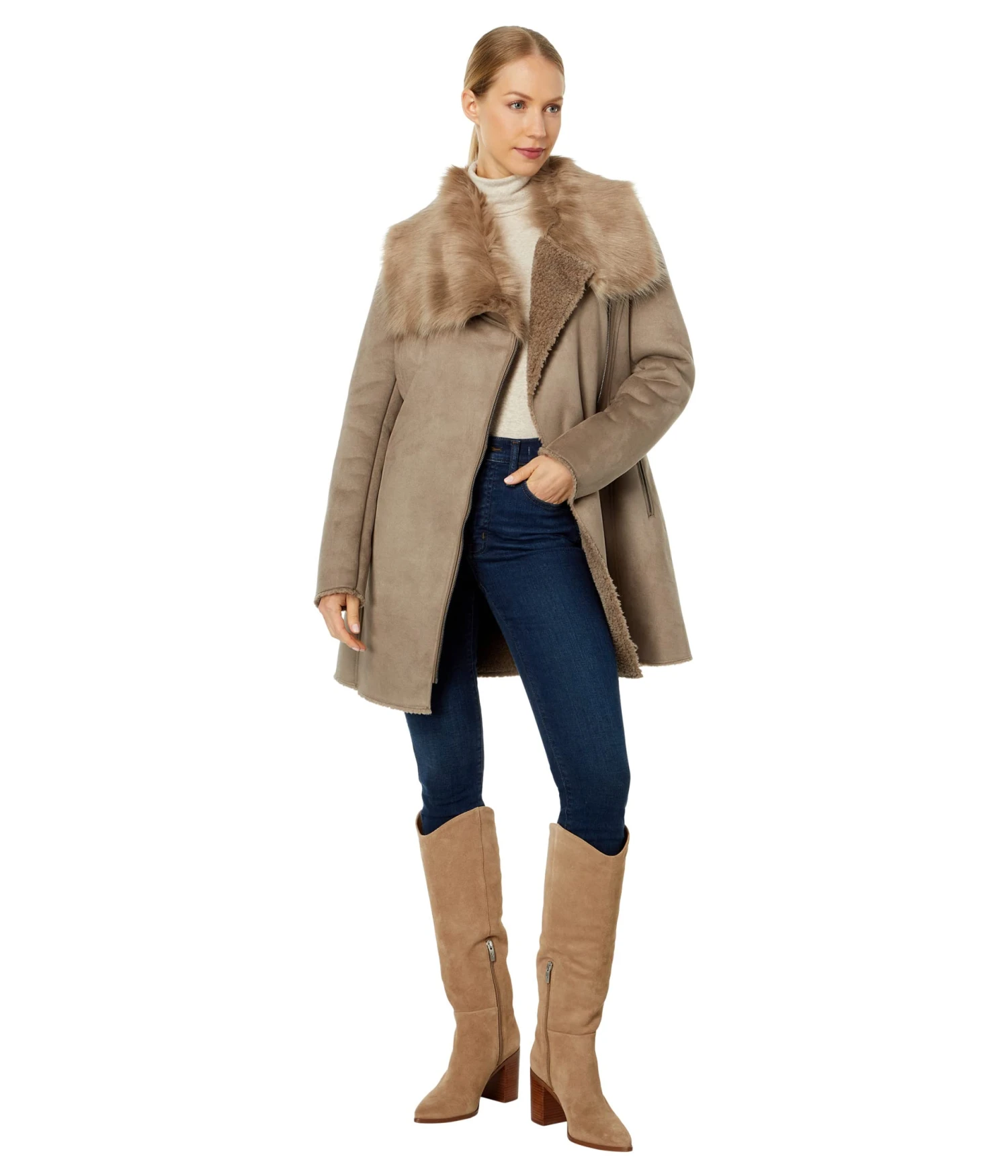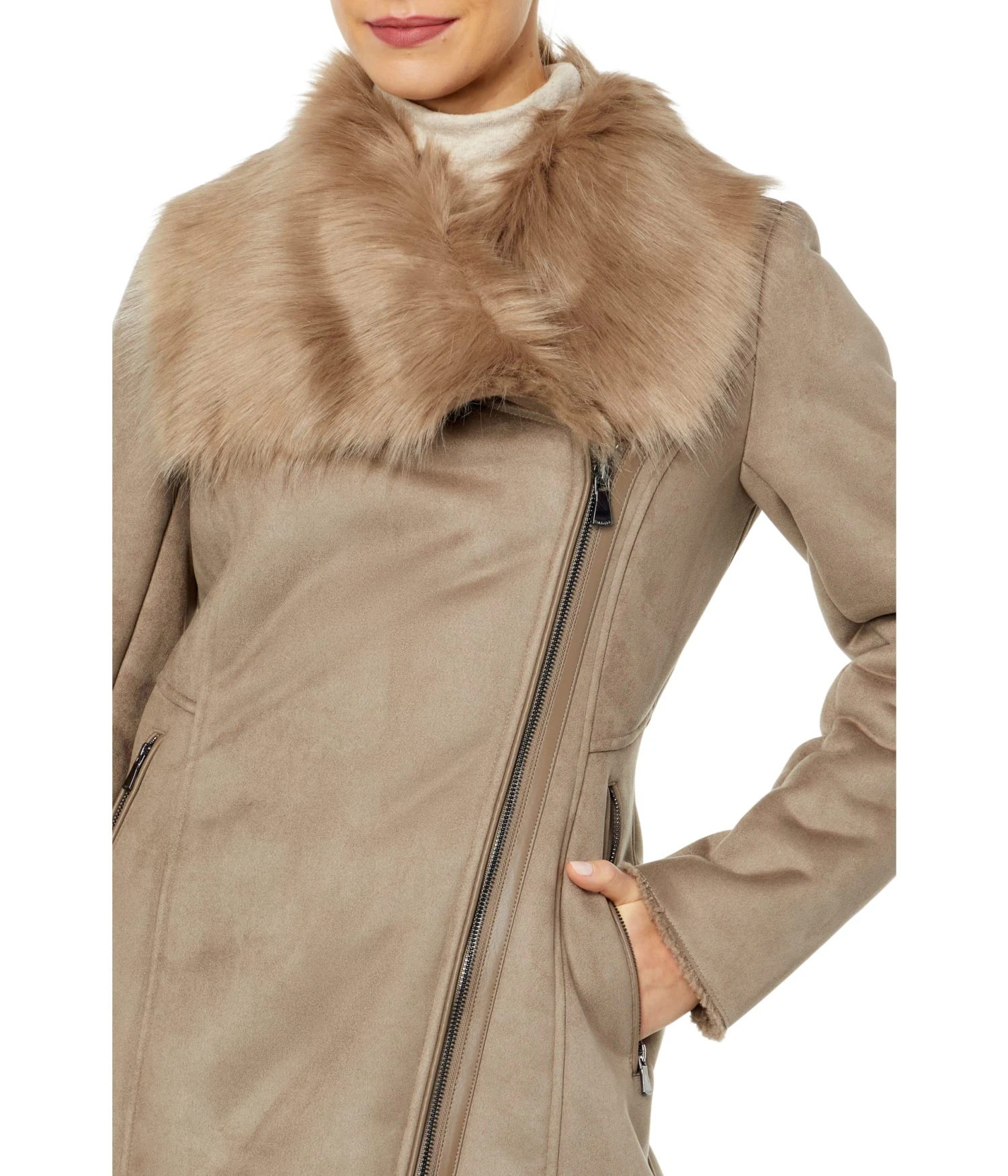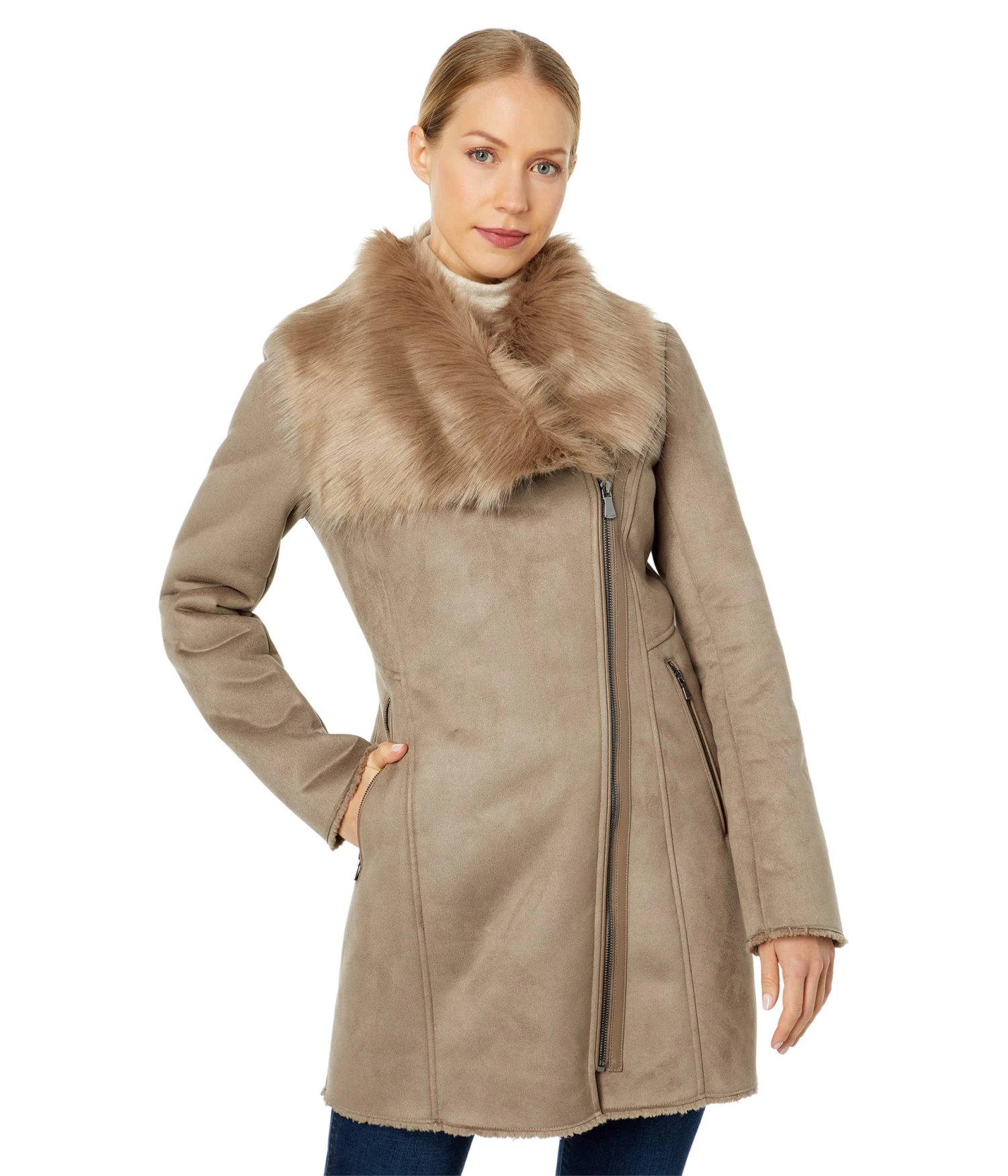 - Add a dramatic touch to your look wearing the Calvin Klein® Asymmetrical Faux Shearling overcoat.