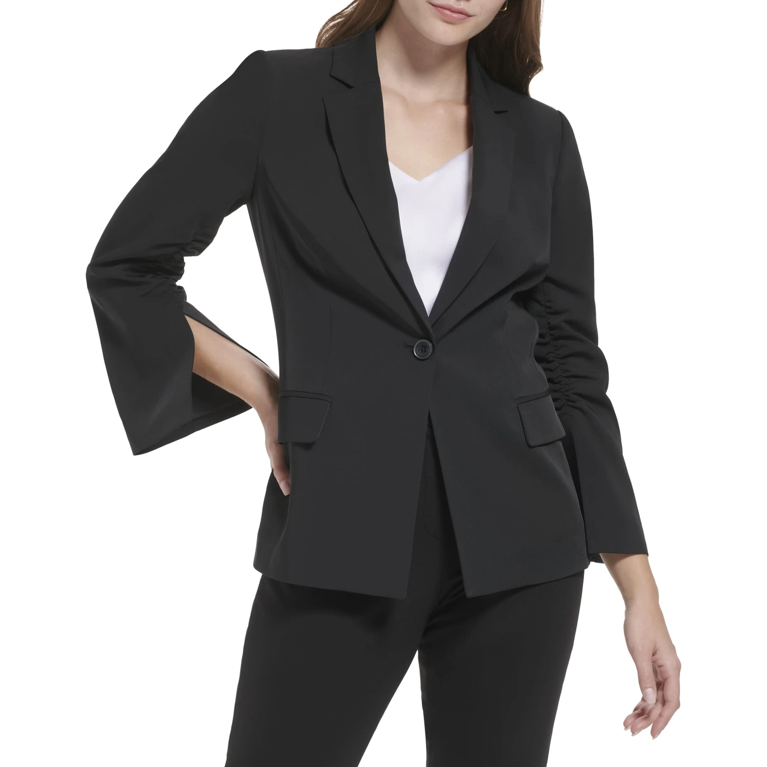 - Calvin Klein® One-Button Jacket with Ruched Sleeve.