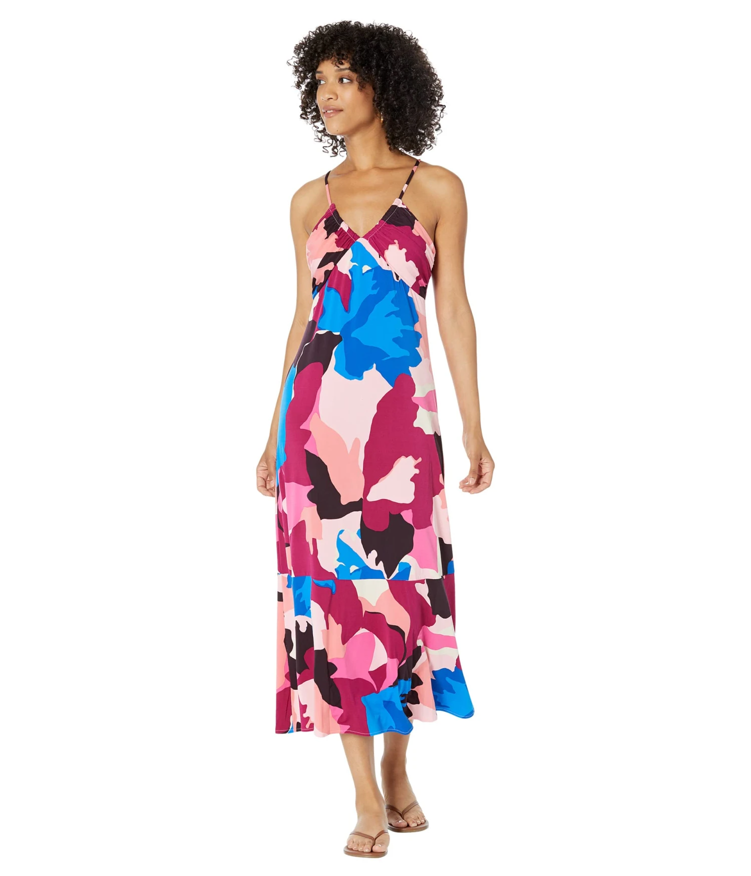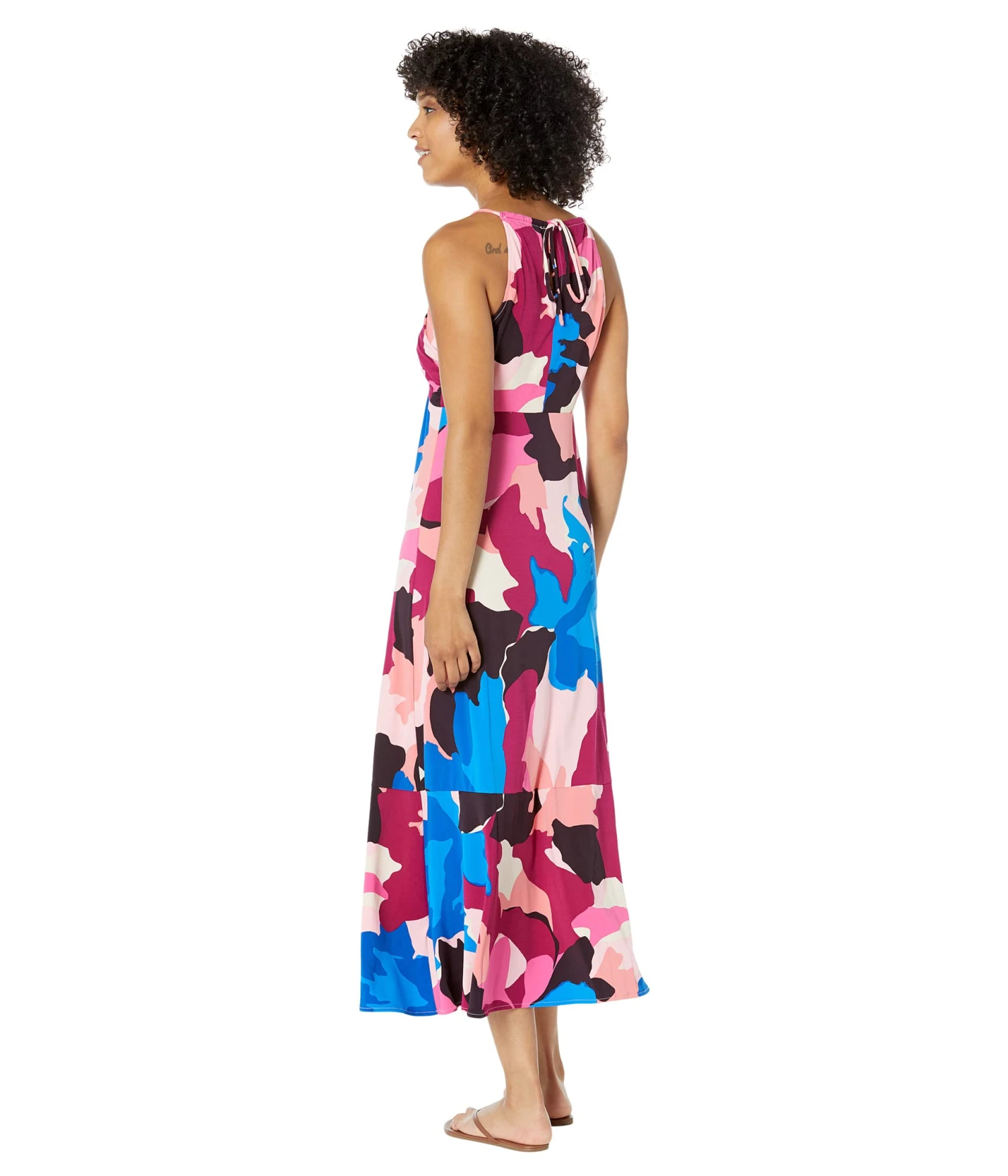 - The Donna Morgan™ Printed Halter Midi Dress looks cheerful and bright and offers a chic look.