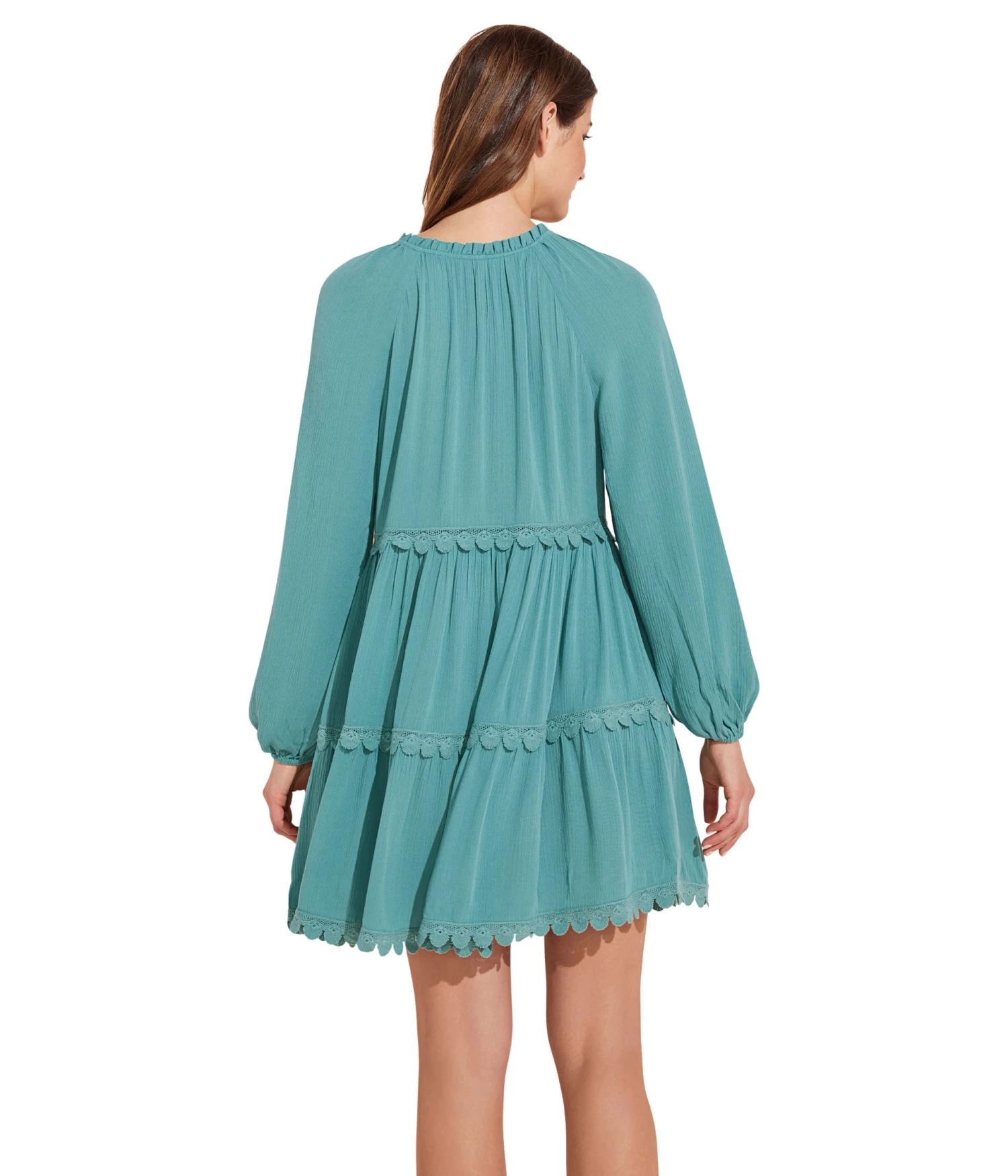 - Tiered skirt with scalloped trims.