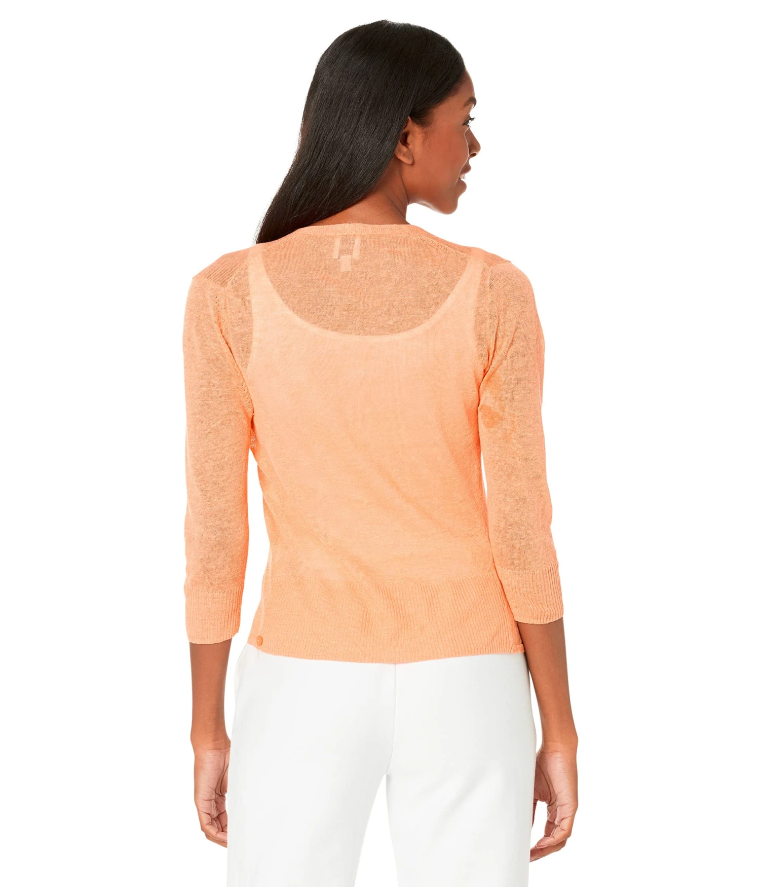 - Open front design with concealed buttons on interior sides.
