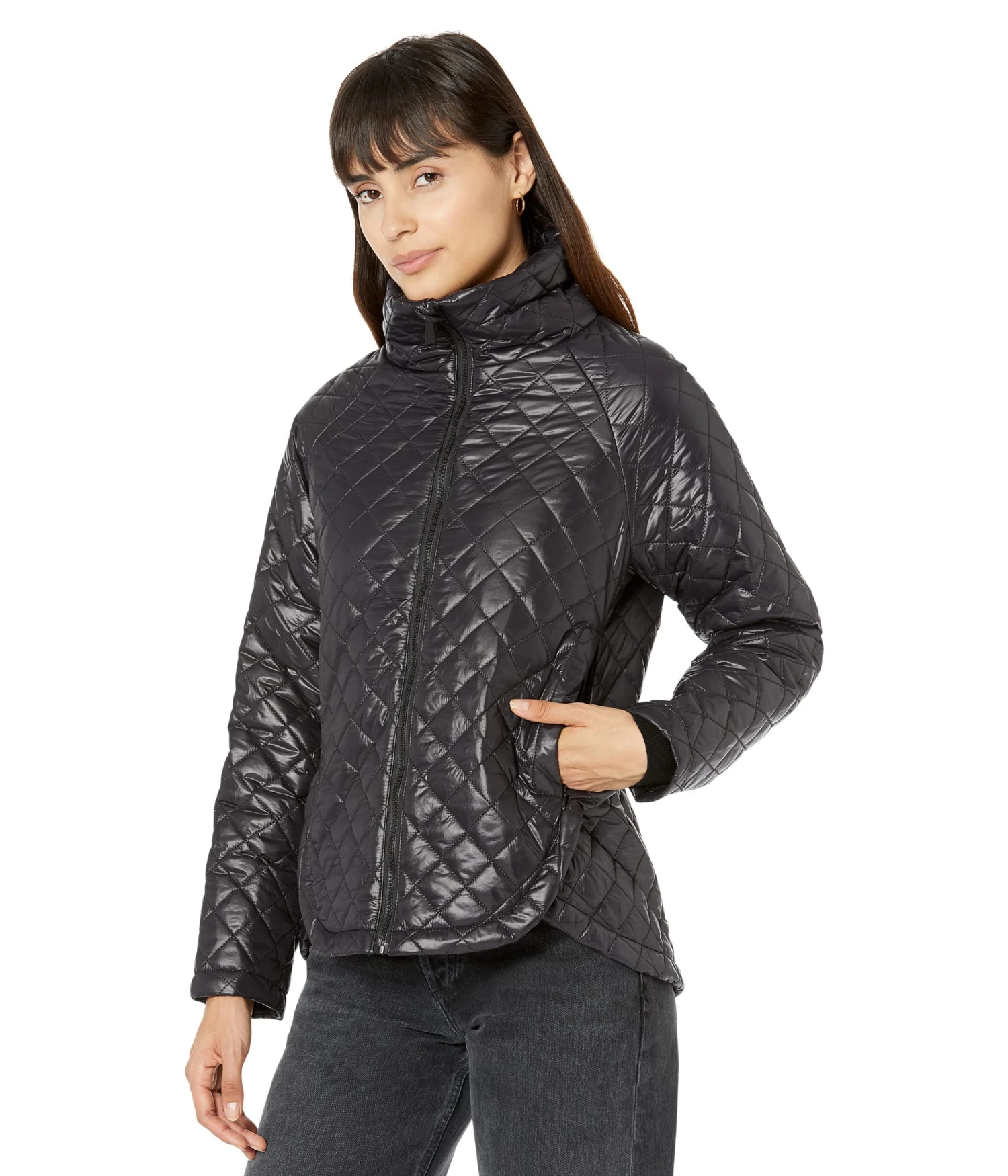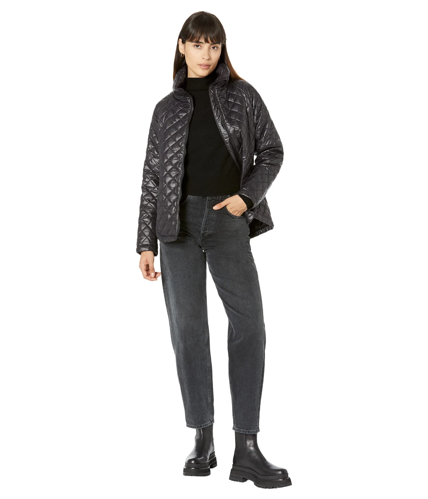 - Stand collar with front zipper closure.