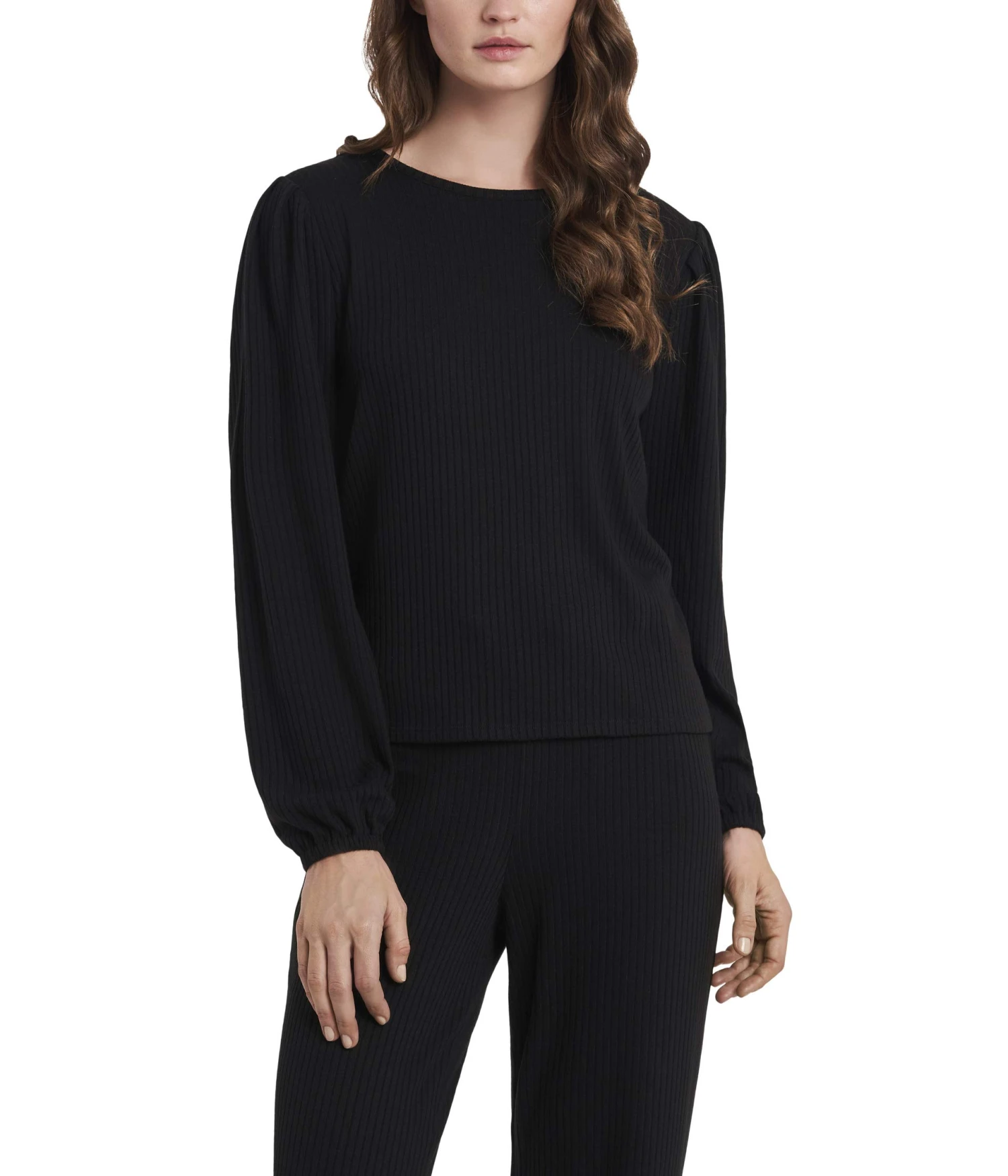 - Rib knit pullover has a slim fit in the body and roomy sleeves.